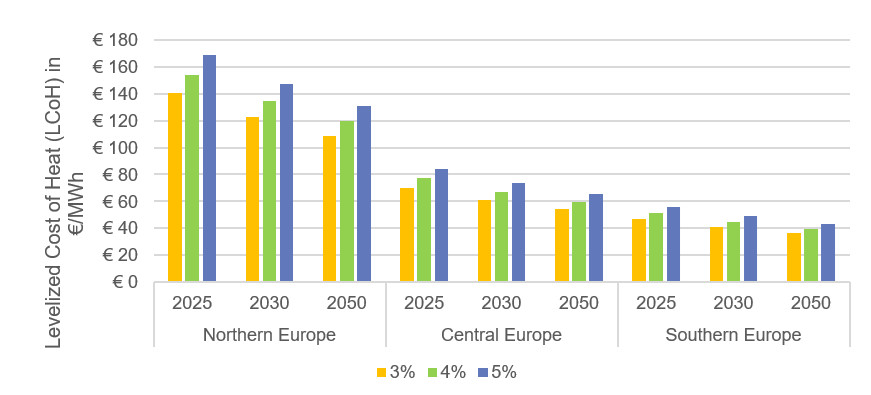 For the central European locations, the LCOH has a baseline between 70 EUR/MWh and 84 EUR/MWh, depending on the given discount rate and the assumed lifetime. In 2030 and 2050, the LCOH using a 4% discount rate is estimated to drop to 67 and 60 EUR/MWh, respectively.